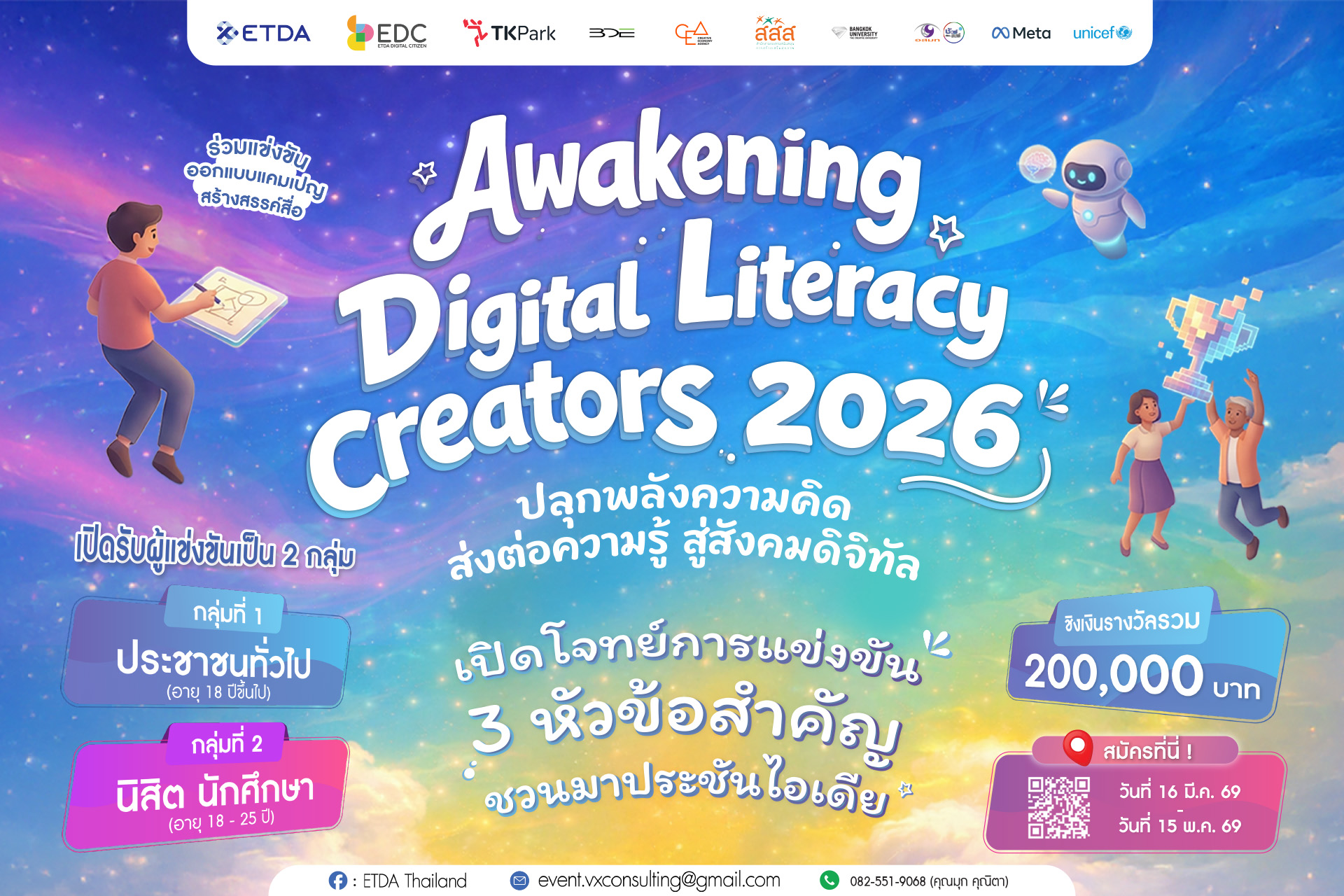 เปิดรับสมัครแล้ว! “Awakening Digital Literacy Creator 2026” เวทีประชันไอเดียสร้างสรรค์ ชวนคนไทยรู้เท่าทันโลกดิจิทัลและ AI ที่เปลี่ยนเร็ว พร้อมโอกาสต่อยอดผลงานให้ใช้งานจริงกับ ETDA