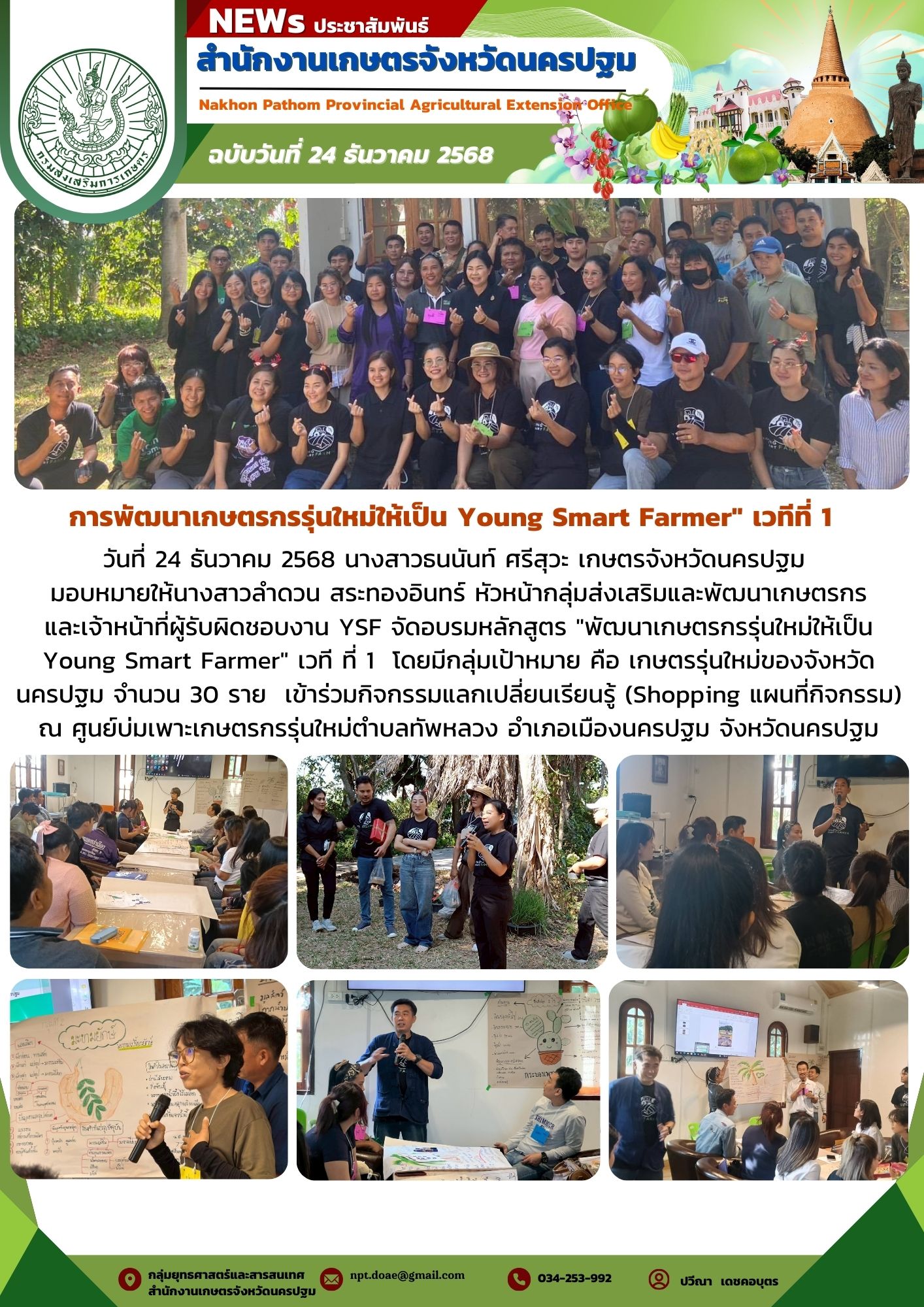 และเจ้าหน้าที่ผู้รับผิดชอบงาน YSF จัดอบรมหลักสูตร “พัฒนาเกษตรกรรุ่นใหม่ให้เป็น Young Smart Farmer” เวที ที่ 1 โดยมีกลุ่มเป้าหมาย คือ เกษตรรุ่นใหม่ของจังหวัดนครปฐม จำนวน 30 ราย เข้าร่วมกิจกรรมแลกเปลี่ยนเรียนรู้ (Shopping แผนที่กิจกรรม) ณ ศูนย์บ่มเพาะเกษตรกรรุ่นใหม่ตำบลทัพหลวง อำเภอเมืองนครปฐม จังหวัดนครปฐม