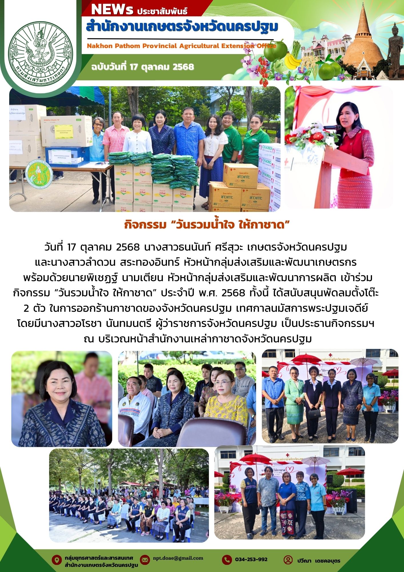 พร้อมด้วยนายพิเชฏฐ์ นามเตียน หัวหน้ากลุ่มส่งเสริมและพัฒนาการผลิต เข้าร่วมกิจกรรม “วันรวมน้ำใจ ให้กาชาด” ประจำปี พ.ศ. 2568 ทั้งนี้ ได้สนับสนุนพัดลมตั้งโต๊ะ 2 ตัว ในการออกร้านกาชาดของจังหวัดนครปฐม