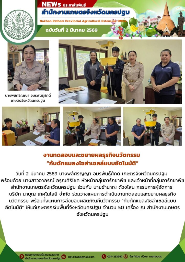 พร้อมด้วย นางสาวอาภรณ์ อรุณศิริโชค หัวหน้ากลุ่มอารักขาพืช และเจ้าหน้าที่กลุ่มอารักขาพืช สำนักงานเกษตรจังหวัดนครปฐม ร่วมกับ นายชำนาญ ด้วงโสน กรรมการผู้จัดการบริษัท นาบุญ เทคโนโลยี จำกัด ร่วมวางแผนการดำเนินงานทดสอบและขยายผลธุรกิจนวัตกรรม พร้อมทั้งแผนการส่งมอบผลิตภัณฑ์นวัตกรรม “กับดักแมลงโซล่าเซลล์แบบอัตโนมัติ” ให้แก่เกษตรกรในพื้นที่จังหวัดนครปฐม จำนวน 50 เครื่อง ณ สำนักงานเกษตรจังหวัดนครปฐม