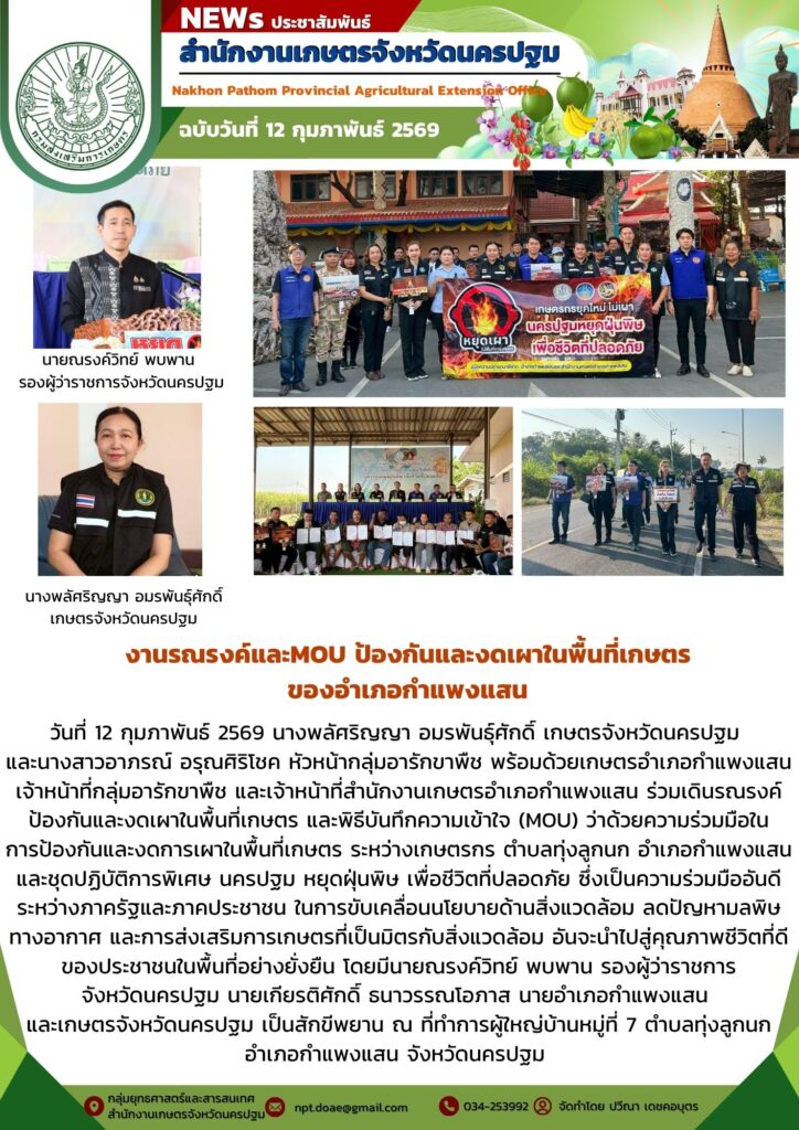 เจ้าหน้าที่กลุ่มอารักขาพืช และเจ้าหน้าที่สำนักงานเกษตรอำเภอกำแพงแสน ร่วมเดินรณรงค์ป้องกันและงดเผาในพื้นที่เกษตร และพิธีบันทึกความเข้าใจ (MOU) ว่าด้วยความร่วมมือในการป้องกันและงดการเผาในพื้นที่เกษตร