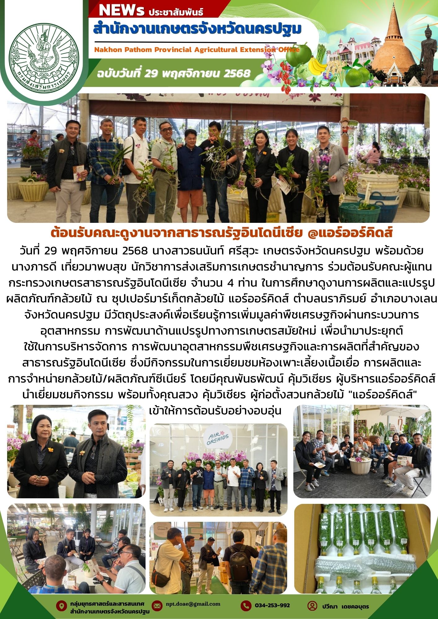 นางภารดี เที่ยวมาพบสุข นักวิชาการส่งเสริมการเกษตรชำนาญการ ร่วมต้อนรับคณะผู้แทนกระทรวงเกษตรสาธารณรัฐอินโดนีเซีย จำนวน 4 ท่าน ในการศึกษาดูงานการผลิตและแปรรูปผลิตภัณฑ์กล้วยไม้ ณ ซุปเปอร์มาร์เก็ตกล้วยไม้