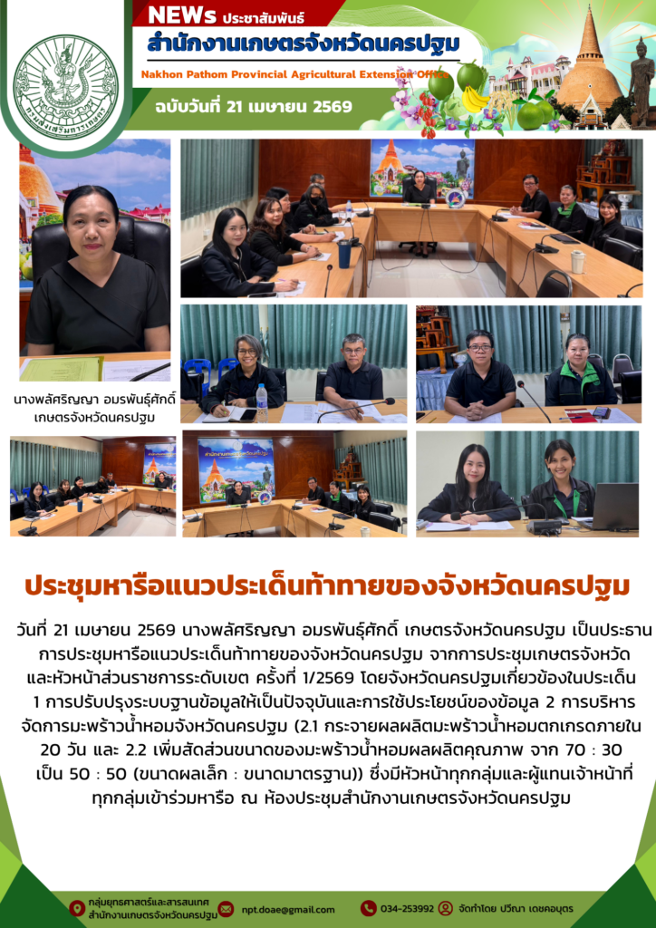 วันที่ 21 เมษายน 2569 นางพลัศริญญา อมรพันธุ์ศักดิ์ เกษตรจังหวัดนครปฐม เป็นประธานการประชุมหารือแนวประเด็นท้าทายของจังหวัดนครปฐม จากการประชุมเกษตรจังหวัด