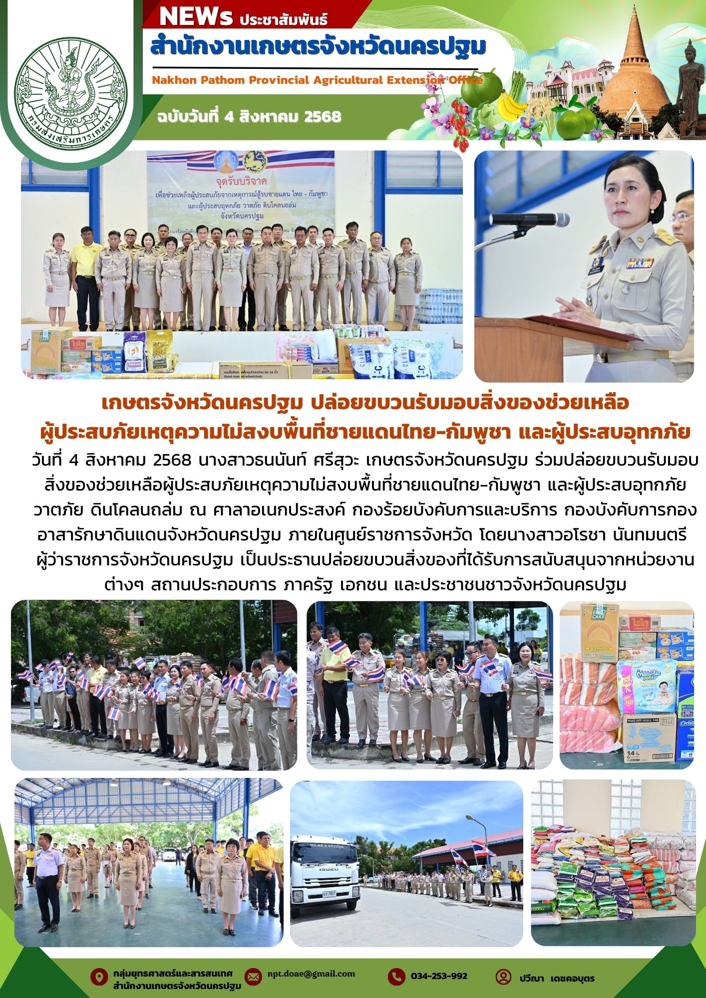 วันที่ 4 สิงหาคม 2568 นางสาวธนนันท์ ศรีสุวะ เกษตรจังหวัดนครปฐม ร่วมปล่อยขบวนรับมอบสิ่งของช่วยเหลือผู้ประสบภัยเหตุความไม่สงบพื้นที่ชายแดนไทย-กัมพูชา และผู้ประสบอุทกภัย