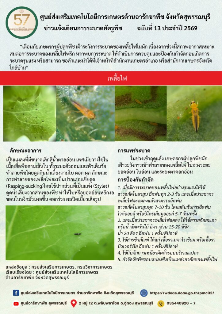 “เตือนภัยเกษตรกรผู้ปลูกพืช เฝ้าระวังการระบาดของเพลี้ยไฟในผัก เนื่องจากช่วงนี้สภาพอากาศเหมาะสมต่อการระบาดของเพลี้ยไฟพริก หากพบการระบาด ให้ดำเนินการควบคุมและป้องกันกำจัดก่อนเกิดการระบาดรุนแรง หรือสามารถ ขอคำแนะนำได้ที่เจ้าหน้าที่สำนักงานเกษตรอำเภอ หรือสำนักงานเกษตรจังหวัดใกล้บ้าน”