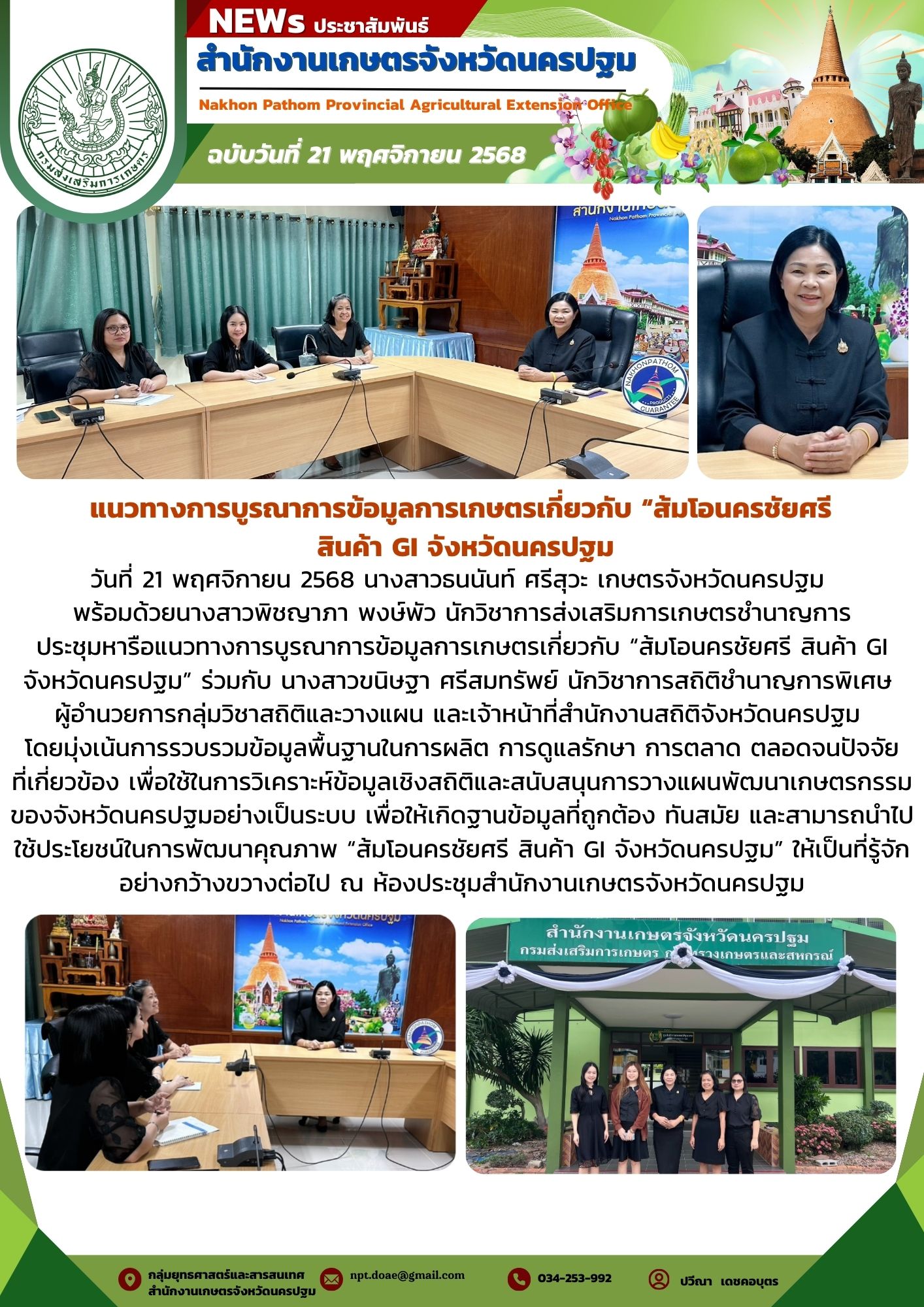 ที่เกี่ยวข้อง เพื่อใช้ในการวิเคราะห์ข้อมูลเชิงสถิติและสนับสนุนการวางแผนพัฒนาเกษตรกรรมของจังหวัดนครปฐมอย่างเป็นระบบ เพื่อให้เกิดฐานข้อมูลที่ถูกต้อง ทันสมัย และสามารถนำไปใช้ประโยชน์ในการพัฒนาคุณภาพ “ส้มโอนครชัยศรี สินค้า GI จังหวัดนครปฐม” ให้เป็นที่รู้จักอย่างกว้างขวางต่อไป ณ ห้องประชุมสำนักงานเกษตรจังหวัดนครปฐม