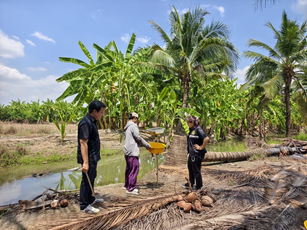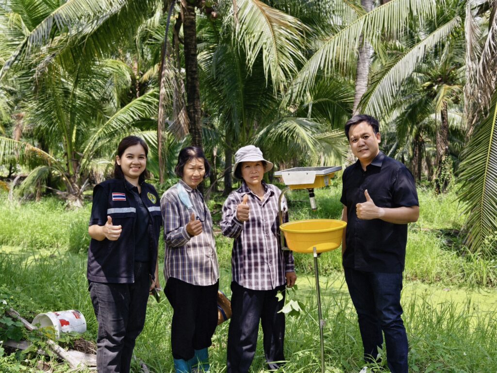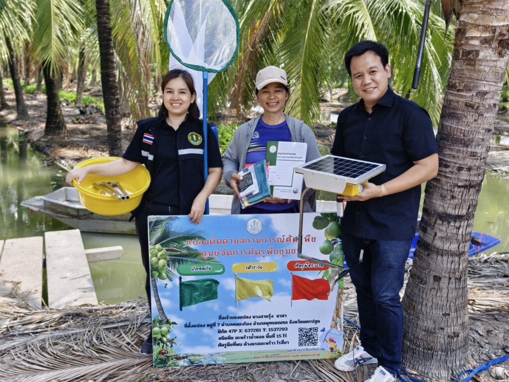 สำหรับการลงพื้นที่ในครั้งนี้ มีวัตถุประสงค์เพื่อสนับสนุนอุปกรณ์ที่จำเป็นให้แก่แปลงติดตามสถานการณ์ศัตรูพืชเป้าหมาย โดยวัสดุที่ส่งมอบประกอบด้วย ป้ายแปลง สวิงโฉบแมลง ธงผ้าสัญลักษณ์ เครื่องวัดอุณหภูมิความชื้นในอากาศ และเอกสารสำรวจแปลง เพื่อให้เกษตรกรใช้ในการสำรวจและเก็บข้อมูลสถานการณ์ศัตรูพืชในแปลงปลูกทุกสัปดาห์ ซึ่งจะช่วยให้สามารถติดตาม เฝ้าระวัง และแจ้งเตือนภัยการระบาดของศัตรูพืชสำคัญในพื้นที่ โดยเฉพาะด้วงแรดมะพร้าวและไรสี่ขามะพร้าวได้อย่างรวดเร็วและทันท่วงที อันจะนำไปสู่การบริหารจัดการศัตรูพืชที่มีประสิทธิภาพและลดความเสียหายของผลผลิตทางการเกษตรต่อไป